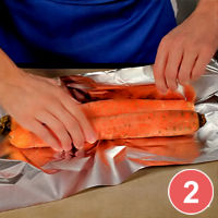2. Морковь вымыть, завернуть каждую в фольгу и запекать в разогретой до 200 °С духовке 10 мин. Дать остыть, затем очистить. Вырезать по всей длине морковок неглубокие горизонтальные бороздки, чтобы на срезе получился «цветочек».