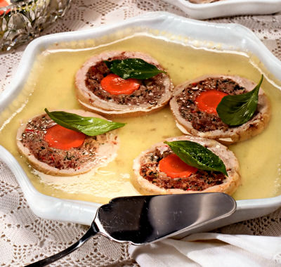 4. Куриное филе нарезать тонкими ломтиками, накрыть пленкой и отбить. На большом кухонном полотенце разложить в веде прямоугольника ломтики курицы так, чтобы они слегка находили друг на друга. Поместить посередине половину приготовленного фарша, по центру уложить в одну линию морковь. Сверху поместить оставшийся фарш. Придать фаршу руками форму полена, накрыть свободными концами куриного филе. Плотно завернуть в полотенце и положить в кастрюлю с бульоном. Варить на небольшом огне 1,5 ч, за 10 мин. до готовности добавить лавровый лист и горошины перца. Снять кастрюлю с огня.