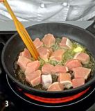 3. На сковороде растопить сливочное масло и обжарить на нем до готовности кубики свинины, время от времени помешивая. Незадолго до окончания жарки добавить чеснок. Обжаренное мясо посолить, приправить по вкусу белым перцем, перемешать, выложить со сковороды и сохранять в тепле.