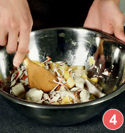 4. Смешать в миске картофель, рыбу и крабовое мясо. Выложить на плоское блюдо.