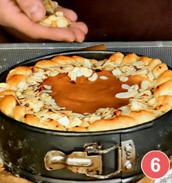 6. Поставить пирог в разогретую до 180 °С духовку примерно на 1 ч. Если верх пирога начнет пригорать, уменьшить температуру до 160 °С. Готовый пирог посыпать миндальными хлопьями и сахарной пудрой. Подавать теплым.