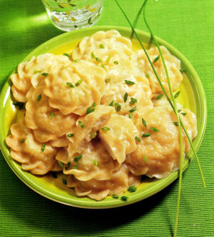 3. Одну часть теста раскатать в тонкий пласт, выемкой с одного края пласта наметить ряд кружочков. В центр каждого кружочка положить порцию фарша, накрыть половиной пласта теста и выемкой вырезать круглые заготовки для пельменей. Края пельменей защипать и отварить в подсоленной воде до готовности. При подаче полить блюдо растопленным сливочным маслом и посыпать измельченным зеленым луком.